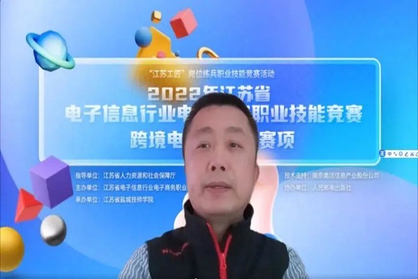 江苏省人力资源和社会保障厅职业能力建设处二级调研员陈彦德线上出席并致辞。他表示,希望以此次竞赛为契机,促进全省不同区域、不同层次的学校与企业之间学习交流,激发广大职工学技术、比技能的热情,为进一步弘扬和传承“工匠精神”,加快培养我省融互联网技术与商务管理于一身的高素质复合型人才,推动企业电子商务应用高速发展。